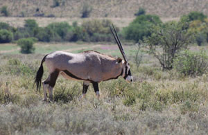 Springböcke, die Nationaltiere Südafrikas, gab es hier in großer Zahl, daneben Strauße und sogar Oryxantilopen. Ganz besonders gut haben uns die Weißschwanzgnus gefallen. Außerdem sollen im Park auch gefährlichere Tiere wie Büffel, Spitzmaulsnashorn und Gepard leben. Trotz ihrer Anwesenheit ist das Camp nicht eingezäunt. Es liegt geduckt am Fuße einer beeindruckenden Bergkulisse, die der Park einschließt und die erahnen läßt, daß man nur im äußersten Glücksfall eines der Nashörner oder einen Geparden überhaupt zu Gesicht bekommt.
